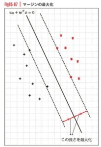 意味としては、内側のminで境界線の距離が最も小さいi番目のデータxを求めつつ、外側のmaximizeでは、切片w0と回帰係数wを動かしつつその距離を最大化する場所を探索するようなものです。