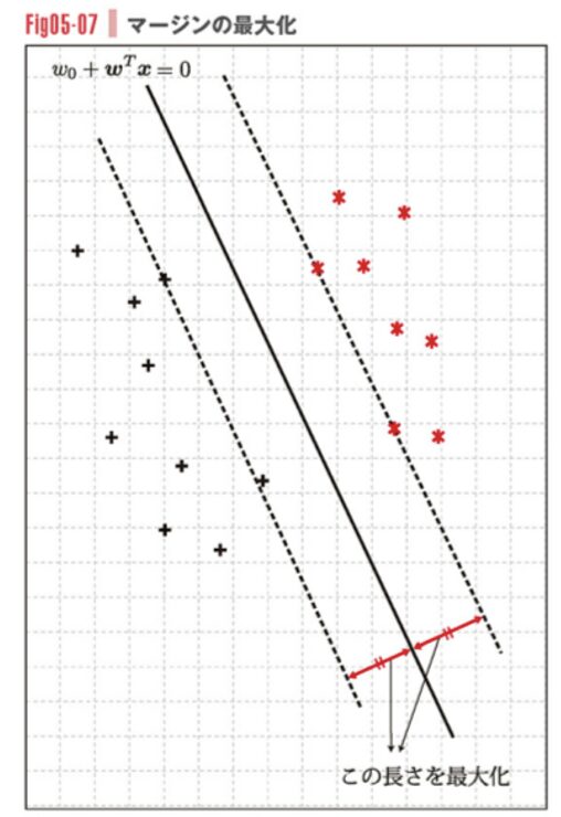 ・mini y(w0 + wTxi) > 1:分類は成功し、境界線から少し離れて最も近い点(データx)が位置